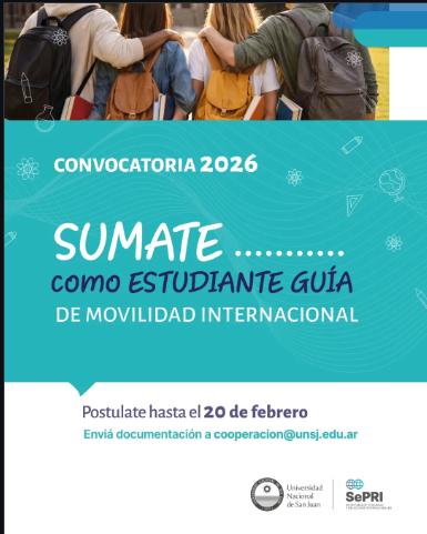 ️¿Querés acompañar a los estudiantes internacionales de Movilidad que vendrán a la UNSJ? La Convocatoria está abierta hasta el 20 de febrero. Los Estudiantes Guía de Movilidad acompañan en la inserción a los estudiantes extranjeros que llegan a la UNSJ para cursar un semestre académico. Los seleccionados recibirán una ayuda económica por la realización de la actividad y una Resolución que acredita las funciones efectuadas. Podrás conocer otras culturas, saber cómo se estudia en distintas universidades a la vez que será un plus en tu CV. ¡¡Apuntate!! Para más info accedé al link de nuestro perfil💪💪💪💪 https://www.instagram.com/p/DUa0lZqkbvJ/?igsh=N2J6anB1OGthaW4=